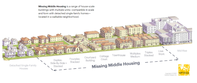 Staff’s recommendation to increase the density of most areas zoned as Residential Neighborhood (R-1) from 8 to 32 dwelling units per acre (du/ac) supports the ability to develop these housing types. The Task Force supported staff’s recommendation, and further provided guidance for staff to additionally explore a maximum of 40 du/ac.